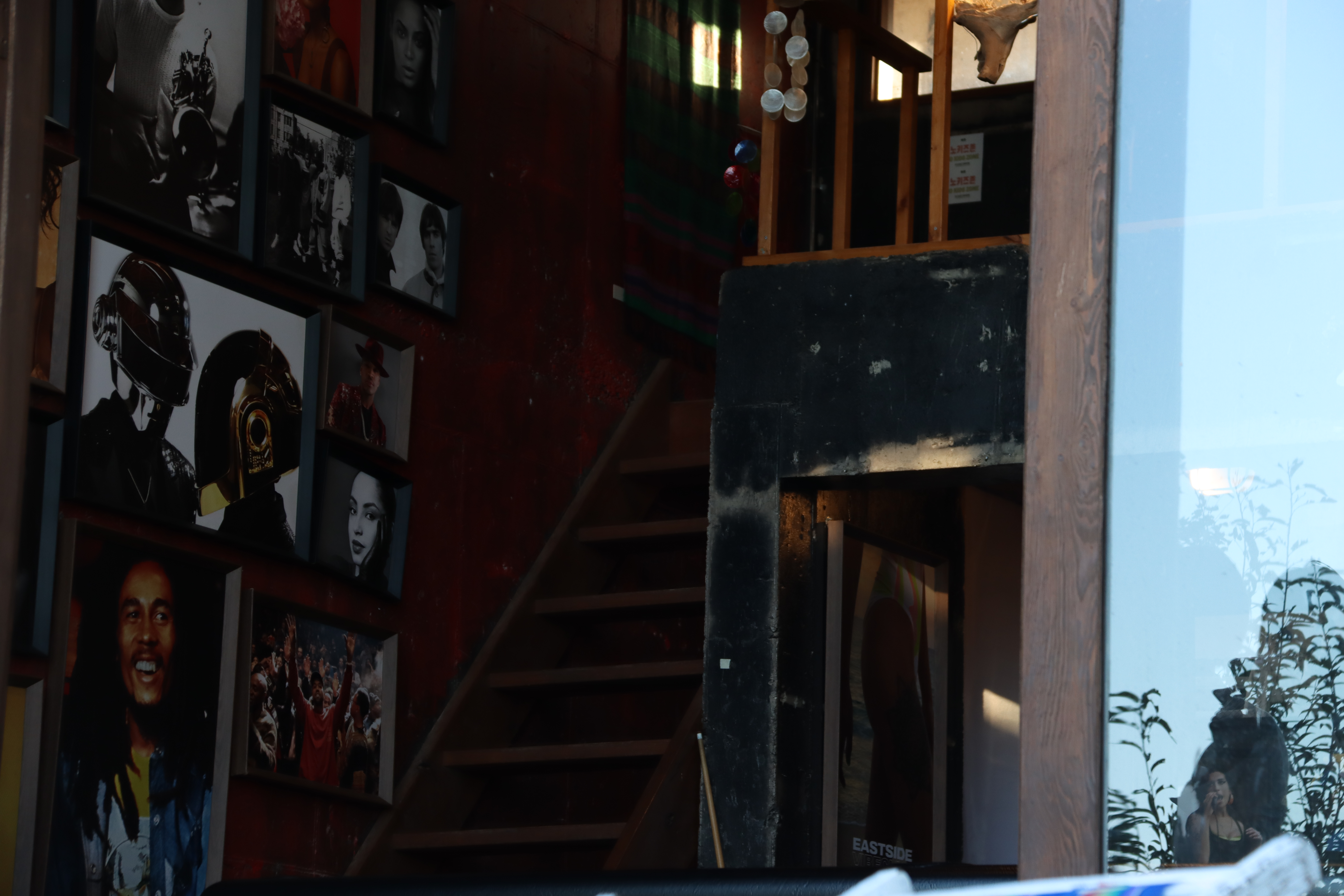 이곳에는 포토뷰가 있는데 가건물 내부로 보이는 나무 계단과 여러 해외 뮤지션들의 사진을 걸어둔 것을 볼 수 있다. 그리고 사람들이 누워서 쉴 수 있도록 의자도 비치 해두었다.