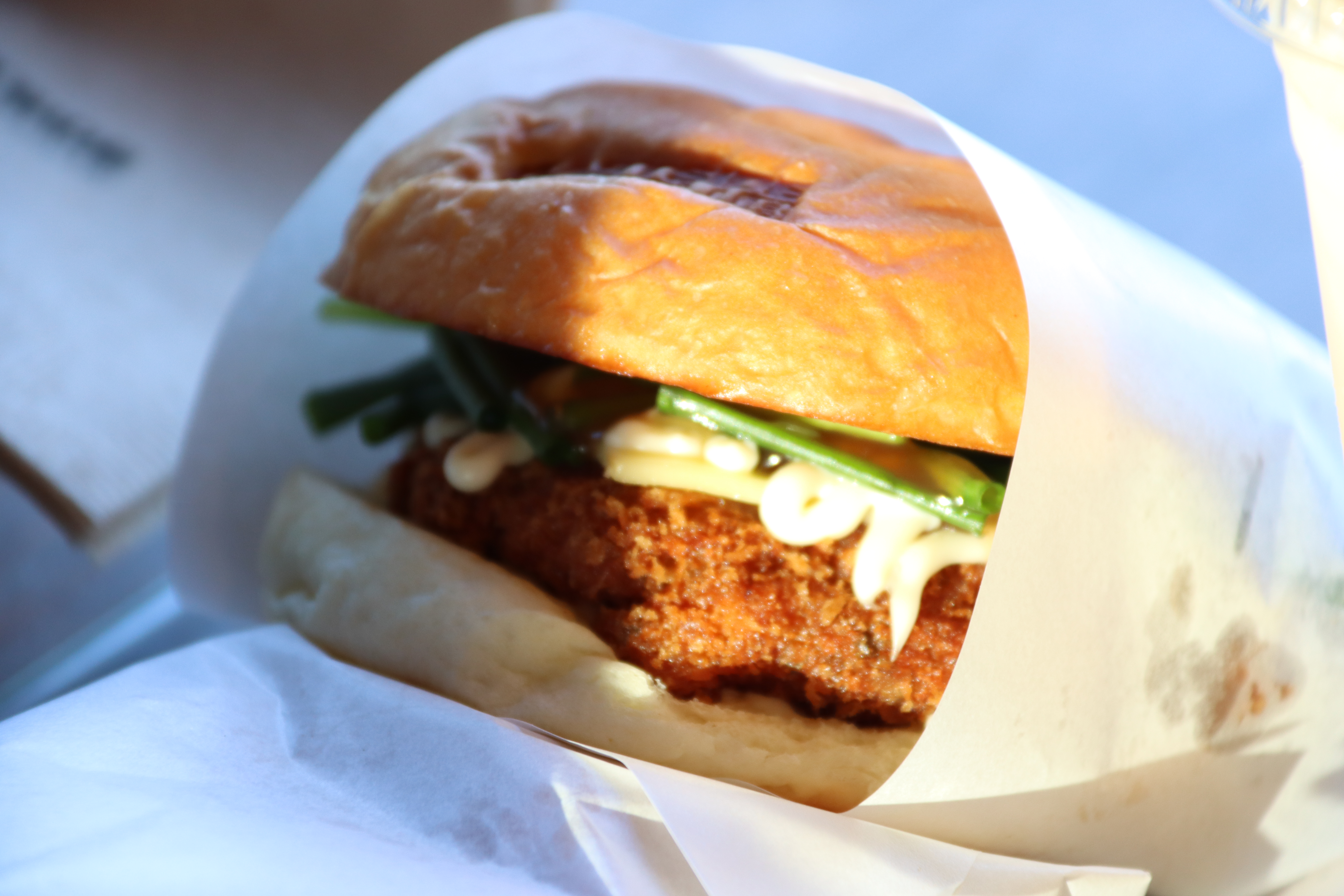 우선 생김새는 튀김 패티에 마늘쫑이 있는 것을 볼 수 있다. 마늘쫑은 맵지 않고 달달하니 맛있다. 근데 이게 마늘쫑인지는 잘 모르겠다. 생김새가 그리 생겨서 붙였다.