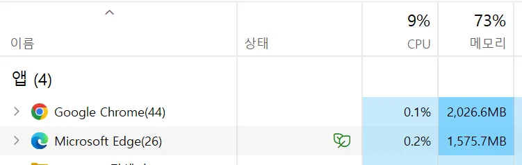 엣지는 현재 유튜브를 4개 킨 상황이고 크롬은 10개 이상 킨 상황이다. 그러면 여기서 승자는 누굴까? 당연히 크롬이다. 단편적으로도 이렇게 차이가 나는데