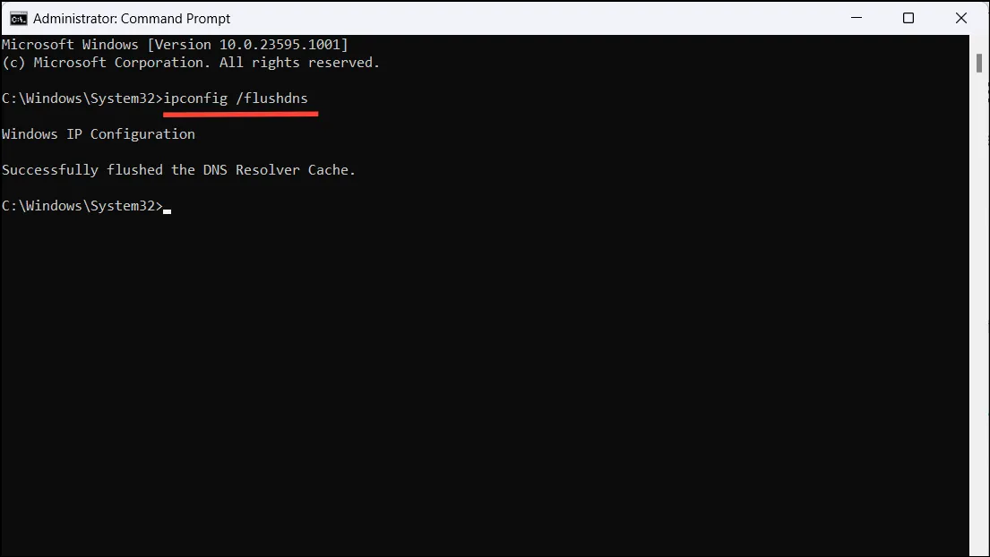 관리자 권한으로 명령 프롬프트를 실행한 후, 다음 명령어를 입력하고 엔터키를 누릅니다: ipconfig /flushdns