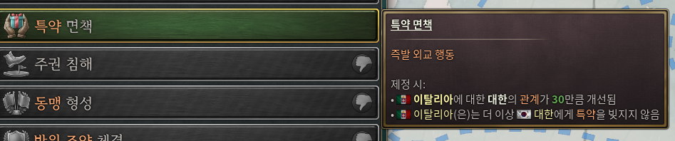 특약을 얻어내는 방법은 간단해보이지만 간단하진 않다. 우선 국력이 세야 한다. 예를 들어 이런 것이다. 나보다 약한 사람에게 도움을 받는 것에 대해 자존심 상한적도 있지 않은가? 빅토리아 3에서도 동일하다 국력이 약하면 플레이어의 도움을 받지도 않을 것이다.