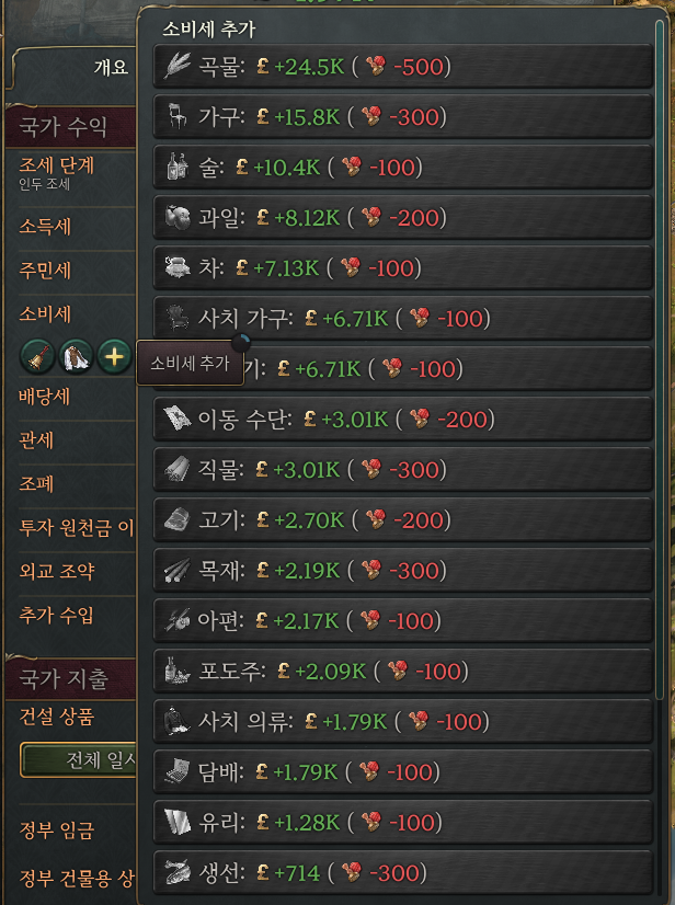 소비세를 물리는 것은 어렵지 않다. 국민의 생활에 직접적인 영향을 갖고 있는 품목에 세금을 물리는 것이다. 초반에 보편적인 세수 확보의 수단으로도 쓰인다고 보면 된다. 소비세를 물리게 되면 대신 권위가 소모가 되어 차후 제조업 장려와 같은 기능을 이용하는데 지장이 있을 수 있다.