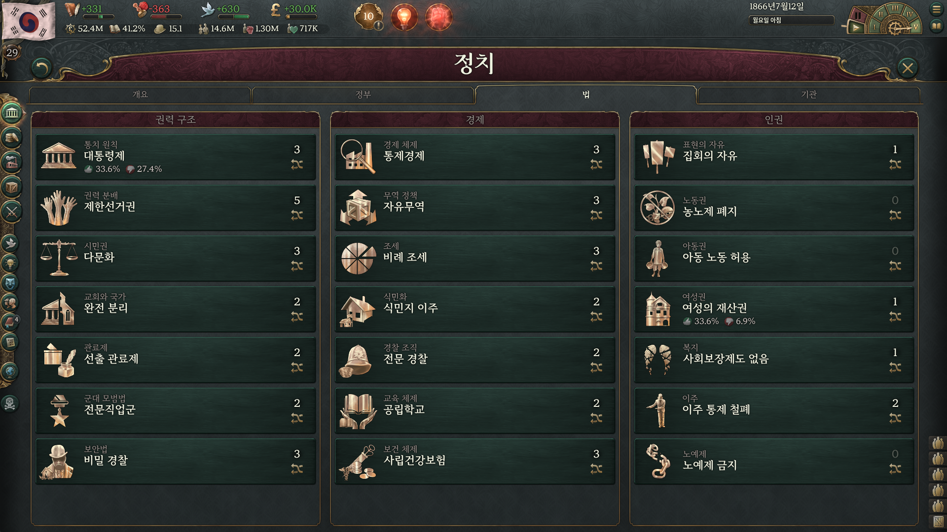 통제경제는 초보자에게 좋은 정책이라 할 수 있는데 무려 조세역량을 25%나 올려준다. 그리고 통제경제의 장점은 모든 기관의 운영을 정부가 하도록 바꿀 수도 있기 때문에 엄청난 세수가 확보될 수 있다. 내수시장을 위주로 플레이를 한다면 되도록 법제정을 해두면 많은 도움이 될 것이다.