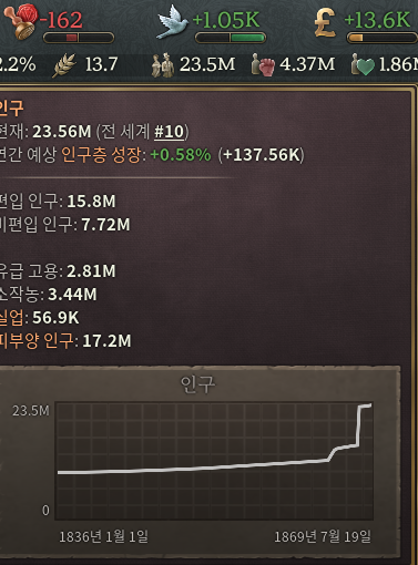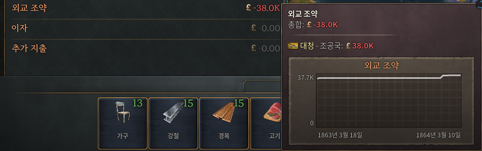 이는 조선으로 시작하면 바로 볼 수 있는 항목 중에 하나인데 바로 조공국의 지위에 있다보니 청나라에게 국고의 10%를 빼앗기고 있는 모습을 볼 수 있다. 물론 독립을 하면 이 부분은 사라지게 된다. 조선의 경우 빠르게 독립하면 할 수록 좋다. 현 수지에서 38k라는 것은 의외로 많은 것을 할 수 있는 재정이다.