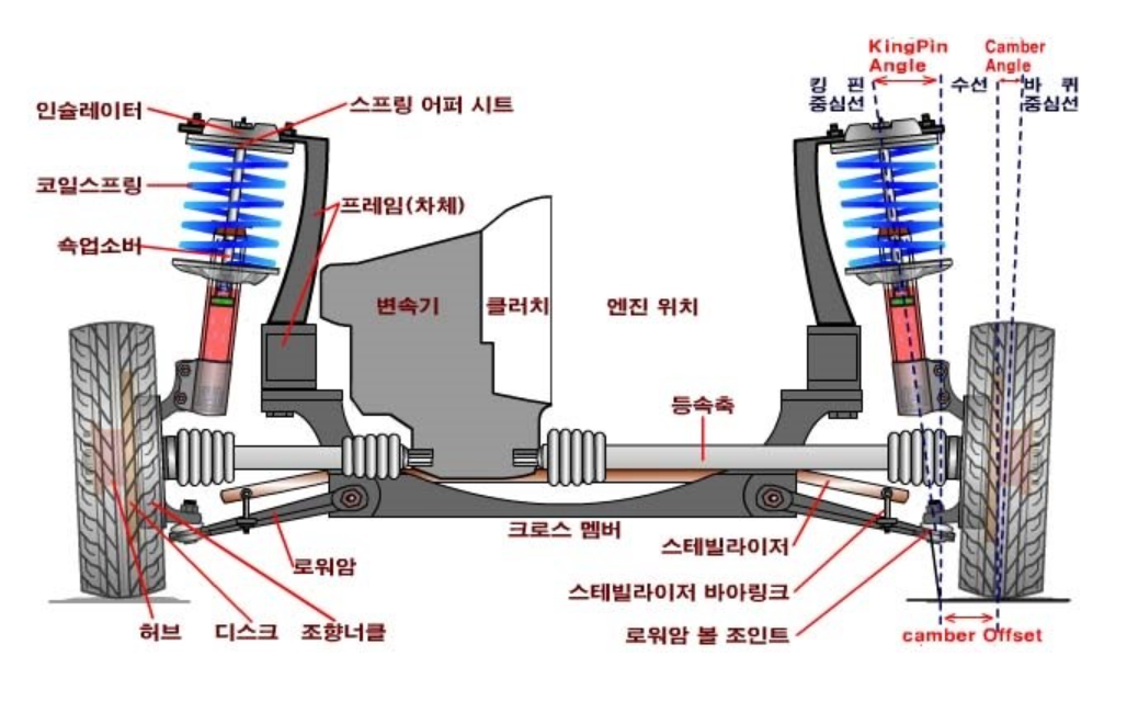 이곳에는 현가장치가 장착되며, 전륜의 경우 조향 장치와도 연결되어 있습니다.