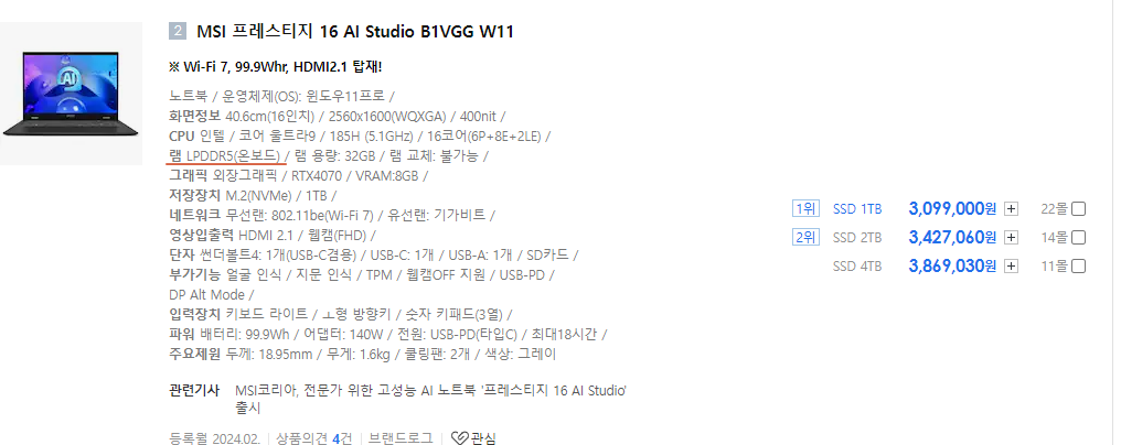 그램에서는 1개는 온보드 8기가를 장착해두었고 나머지 1개는 추가로 장착할 수 있도록 슬롯을 마련해두었으니 참고하시면 됩니다.