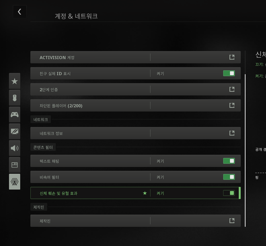 [설정] -[계정 & 네트워크] 에 진입하여 - [신체훼손 및 유혈효과]를 꺼주면 모던워페어 2 고어 효과를 끌 수 있다.