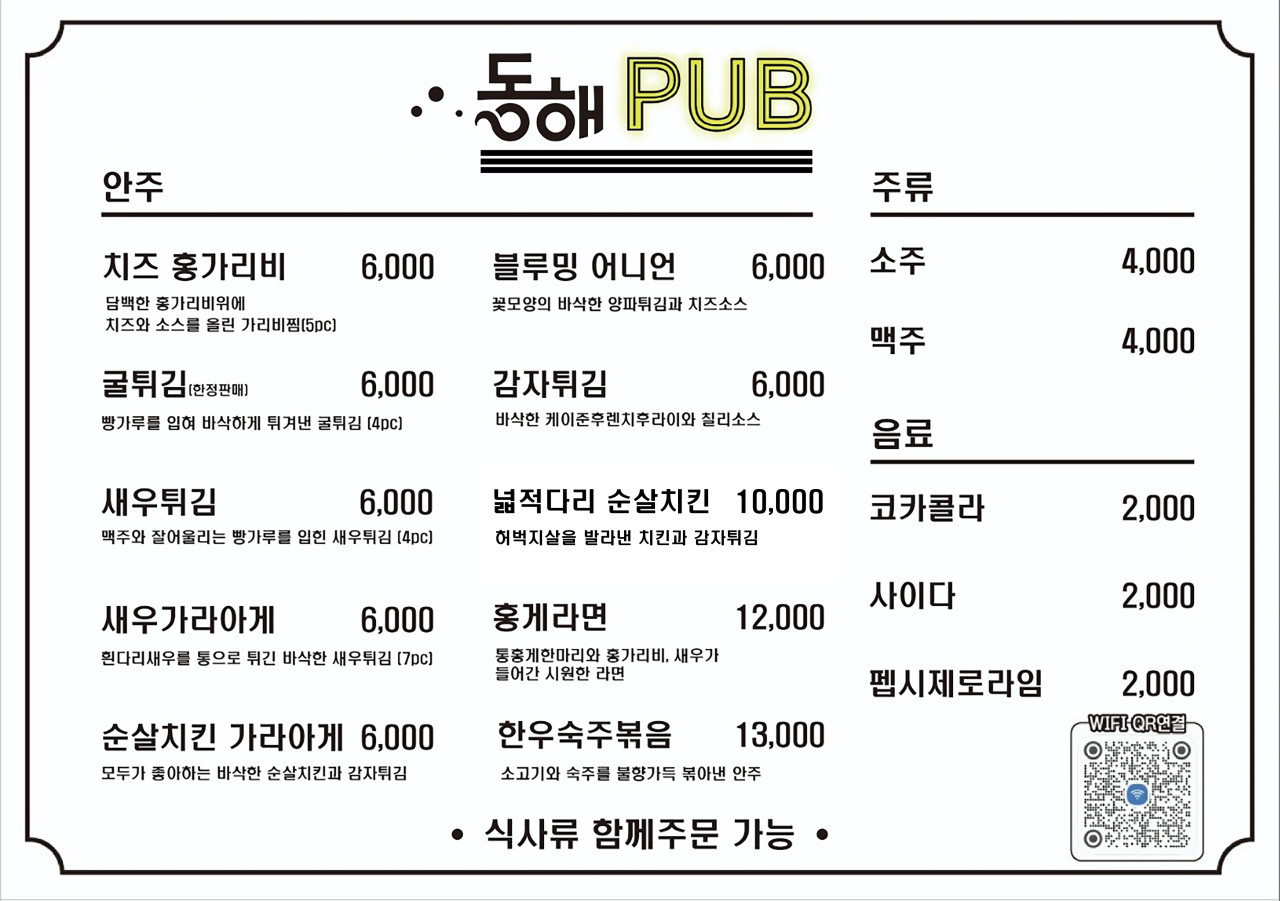 동해펍(PUB)이라고 해서 동해쌀국수만의 안주메뉴인 것 같은데 동해쌀국수에서는 술도 한잔 기울일 수 있기 때문에 안주거리를 부담없는 가격에 맛볼 수 있습니다.