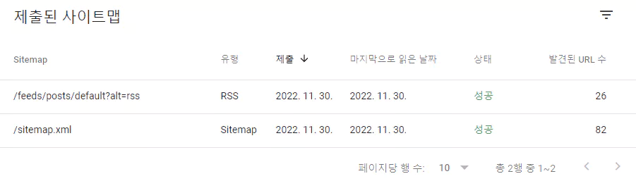 서치콘솔에서 사이트맵을 제출하게 되면 색인이 개선되는 효과가 있다. 색인이라는 것은 구글 검색결과에 내 사이트가 등재되는 것을 의미한다.