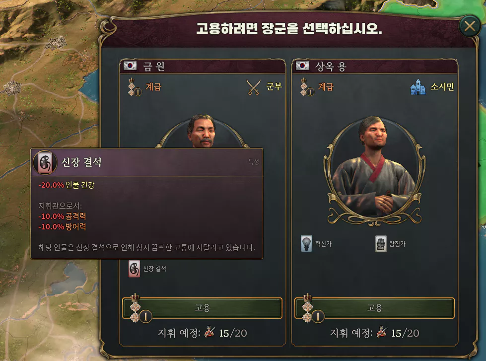 장군은 선택하기 전 셔플 같은 것이 안된다. 처음에 주어진 두 명의 장군 중 제일 좋아보이는 것을 하나 클릭한 후 해고해야지 다른 장군을 고용할 수 있는 길이 열린다.