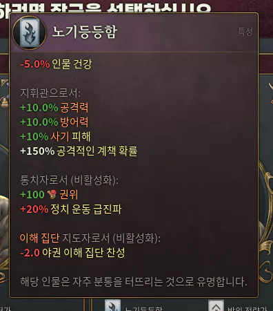 이해집단지도자로써 세운다라는 이벤트가 나오는데 예를 들어 위 사진처럼 야권 이해집단 찬성이 마이너스인 이해집단 지도자보다는 플러스가 좋지 않겠는가? 장군은 성패를 가르기 때문에 특성에 맞게 고용 / 해고를 반복하여 플레이어의 성향에 맞게 뽑는 것이 중요해보인다.