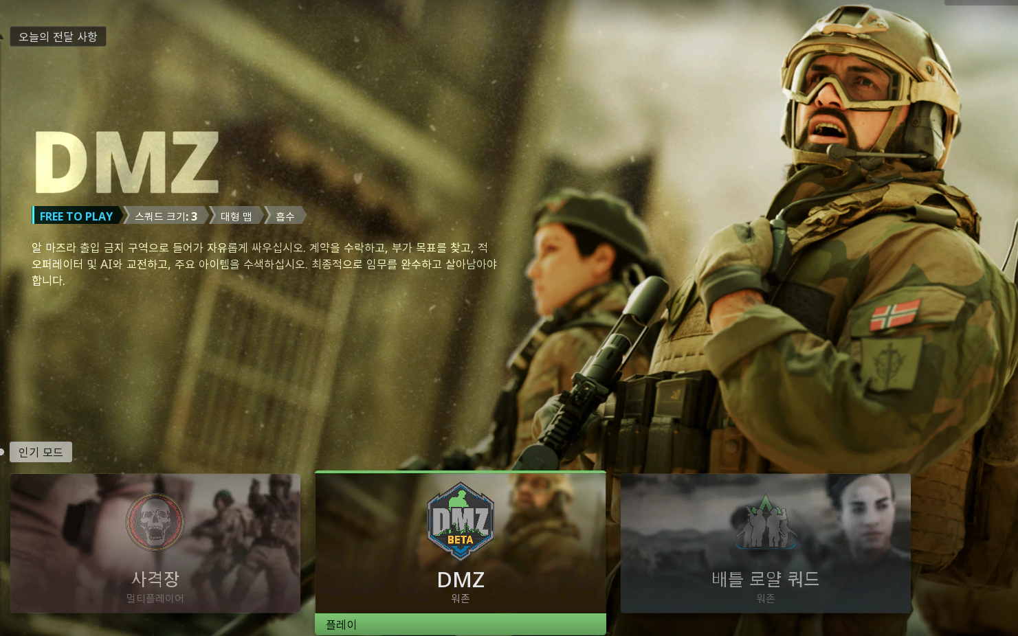 DMZ는 독가스가 살포된 지역에서 컴퓨터와의 전쟁에서 살아남아 탈출하는 시스템인데 여기에는 물론 다른 플레이어들이 같이 플레이를 하게 된다. 그렇지만 워낙 맵이 광범위해서 만날 가능성이 적긴 하지만 한번 죽으면 아이템도 잃어버리고 경험치도 얻을 수 없으니 주의해서 플레이 해야 한다.