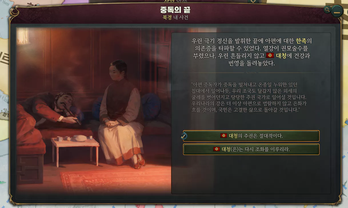 아편금지령이 해제된다면 이제부터는 청나라로 식민지를 만들면 된다. 영국을 이길 정도의 전투력이면 전 세계가 건들지 않기 때문이다. 중독의 끝이라는 일지가 해금되면서 25% 깎였던 공격력과 방어력이 다시 돌아온다.