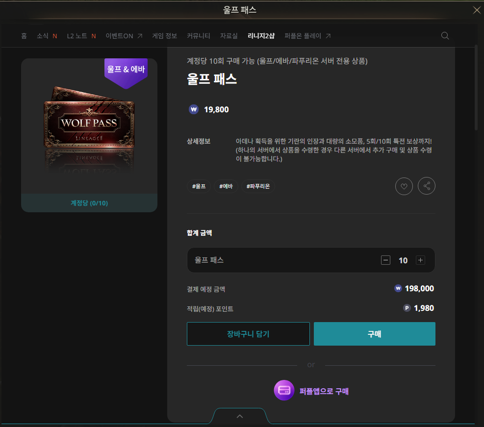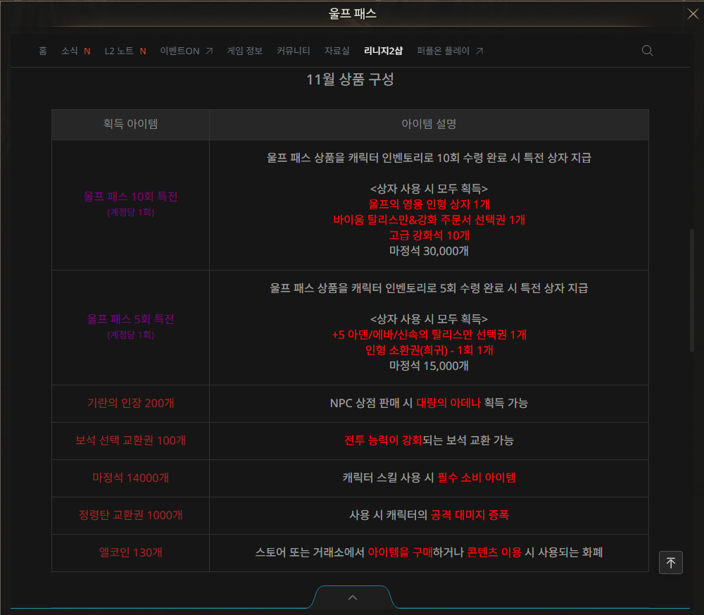 울프패스는 지르지 않아도 게임에는 지장이 없습니다만 79가 넘어가는 시점에서는 영웅인형 하나가 큰 차이가 있기 때문에 이 부분은 리니지2에 조금이라도 몸을 담고 즐겜유저가 되어야 겠다면 반드시 선행되어야 하는 조건이기도 하죠.