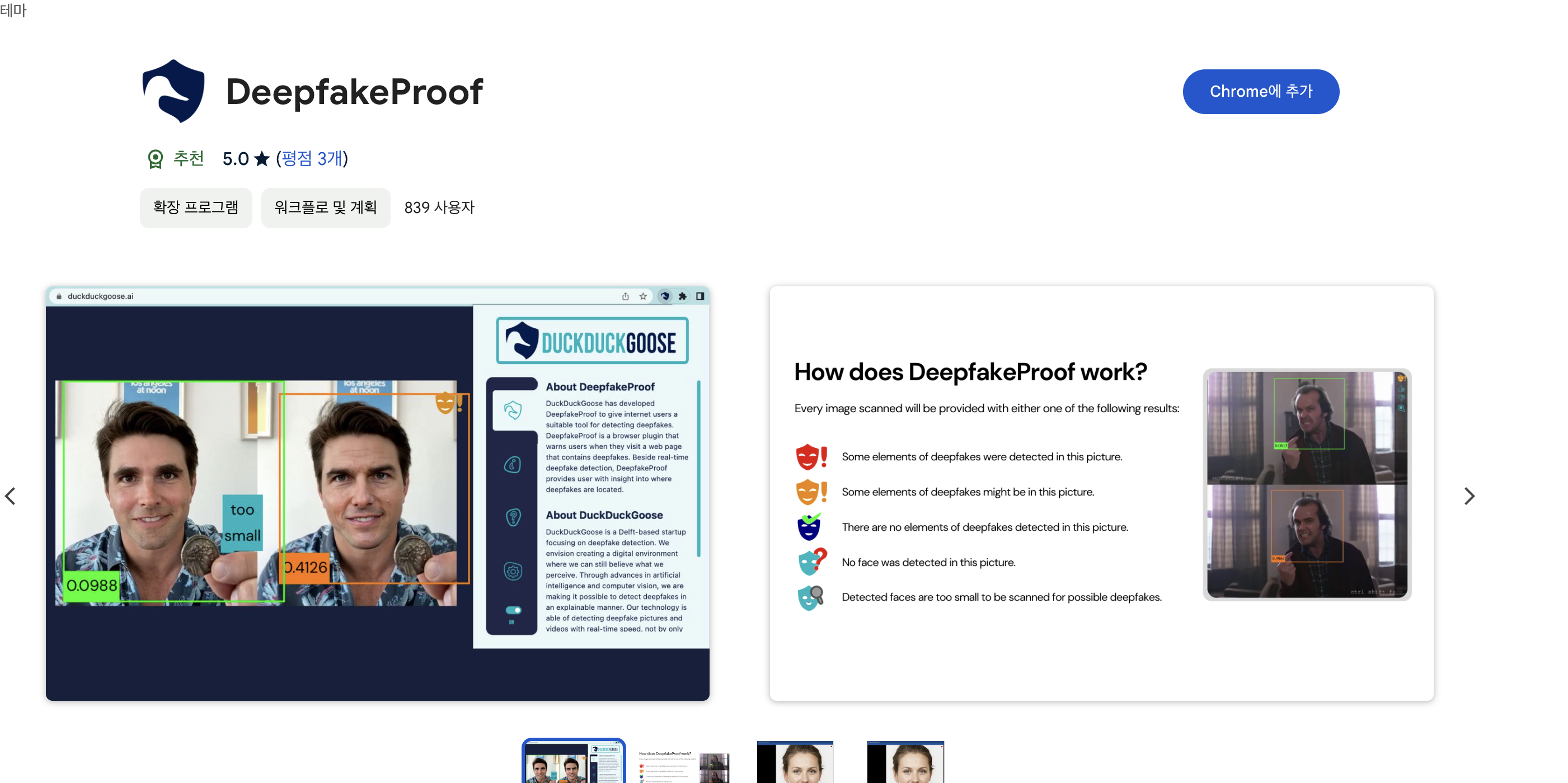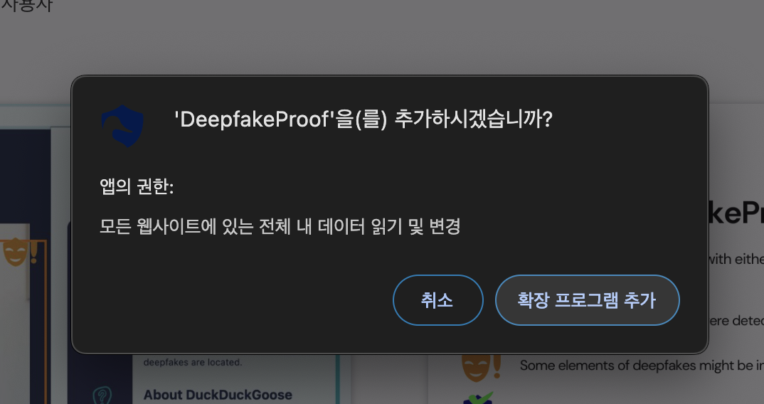 어떤 과정보다 간편하게 크롬 웹 브라우저 스토어로 진입하여 DeepfakeProof를 설치하면 즉시 딥페이크를 확인할 수 있는 쉬운 접근성을 갖고 있는 것이 특징입니다.