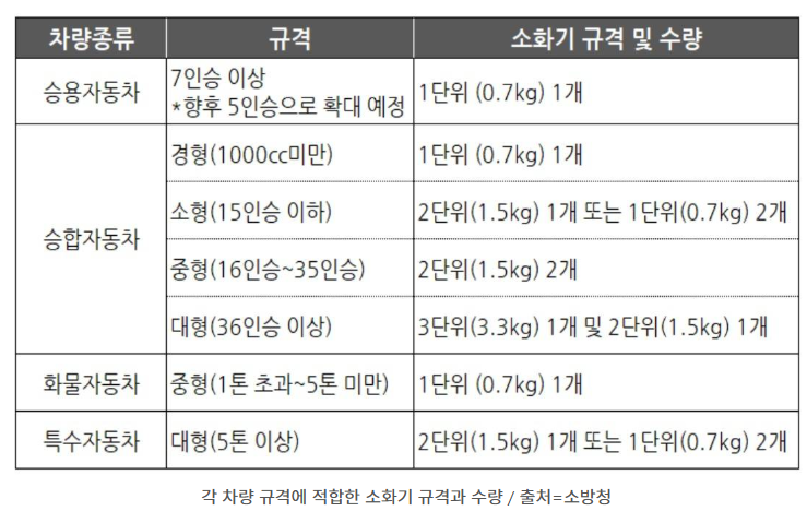 차량 규격별 적합한 소화기 용량 선택