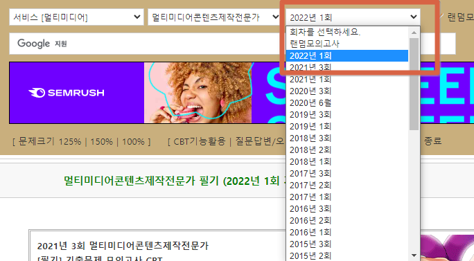 3) 상단의 회차를 클릭하여 랜덤모의고사를 클릭한다. 그러면 모든 시험의 기출문제를 랜덤으로 섞어 출제를 해준다. 단점이 있다면 동일한 문제가 나올 수 있다는 점이다. 물론 동일한 문제가 다른 명칭으로 나오기 때문에 동일한 답을 선택함에 있어서 참고용도로는 아주 좋을 것이다.