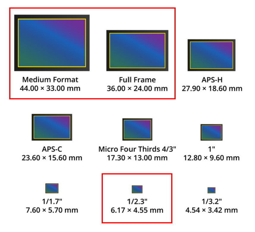 아래는 카메라 이미지 센서에 대한 크기를 나타낸다. 위에서 이야기를 했듯이 이미지 센서가 크면 클수록 빛을 더 많이 수용하여 해상도와 화질이 좋아진다고 이야기를 했다.