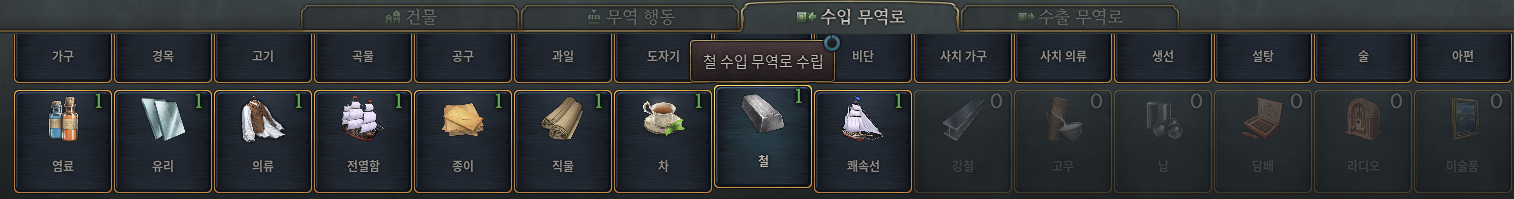 2) 여기서 수입항목을 클릭해보자. 거기에서 ( 공구, 철광석, 나무, 종이 ) 필수 무역항목이니 만큼 무역로를 수립해주자.