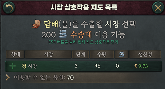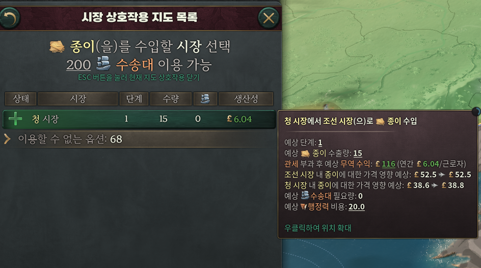 6) 담배플랜테이션을 건설한 직후 다시 무역돋보기를 눌러 담배를 클릭한 후 청나라와 무역로를 개설해준다.