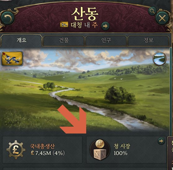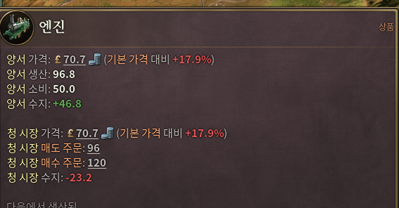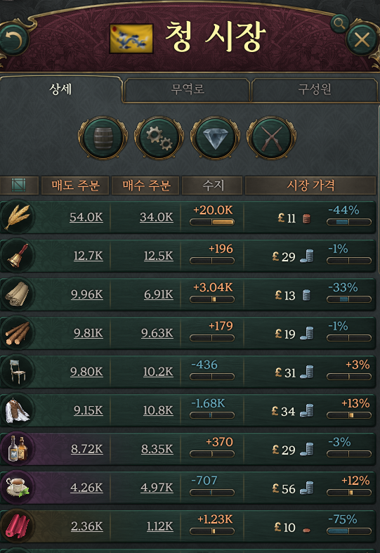 3) 시장을 클릭한 후 [ 상세 ] 탭을 클릭한다. 그러면 아래와 같이 청나라 내수 시장에 관한 항목이 펼쳐지는데 이 항목 중 마이너스 항목은 청나라에서 부족한 항목이고 플러스 항목은 청나라 시장에서 흘러 넘치는 수준이라고 보면 된다.