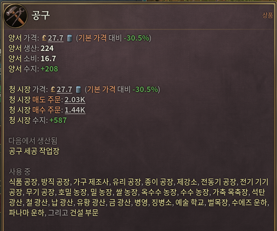 4) 조선은 수입경로가 없어 고급 품목을 만들 수도 없고 그나마 1차산업 (오직 노동력으로만 생산)으로 할 수 있는 산업은 담배 플랜테이션과 공구 그리고 의류가 가장 유력한 상품이라 할 수 있다.