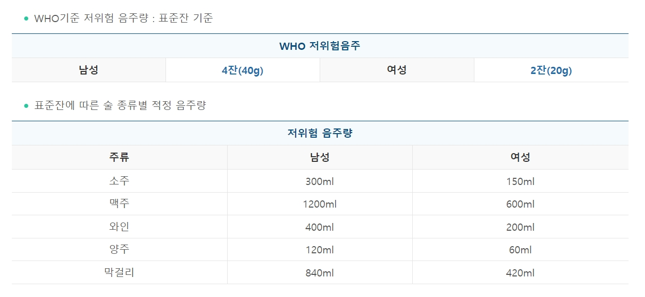 통상 술에는 1잔(소주잔)에 10g정도의 알코올이 있다고 측정한다. WHO기준 저위험 즉, 위험하지 않은 알코올 섭취량은 300ml로 소주 한병이 약 340ml라고 가정했을 때 약 2잔 정도를 남기는 것이 적절하고 여성은 150ml로 남성의 절반 수준이다.